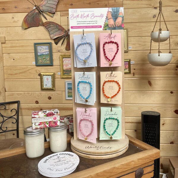 Custom designed to show-off all 12 of the Botanical Bracelets, this handcrafted wooden display has colorful signage at the top and 6 L-shaped hooks per side that keep the carded bracelets securely on the spinner. With a footprint of just 9” in diameter, it’s easy to display it in your store.