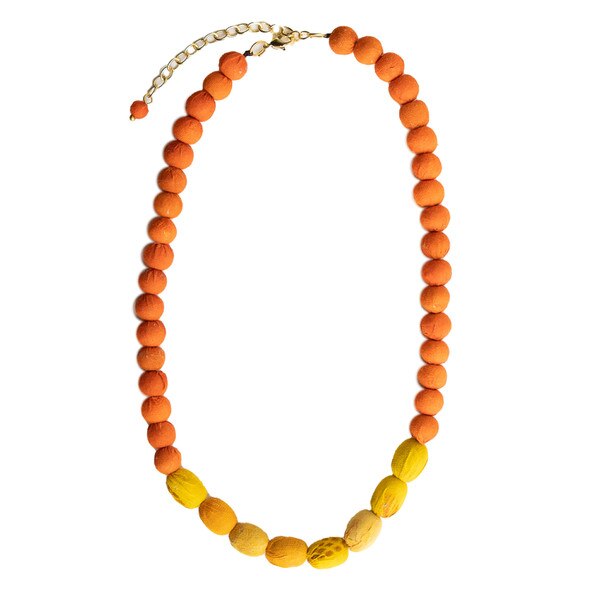 Your new favorite pairing, this colorized Kantha collection matches up complimentary shades for a fresh arrangement. A chain of round beads in Orange is interrupted by a grouping of oval beads in Yellow to form the centered pendant portion. Looks great alone or layered with the other two Couplet Necklaces, or the color-blocked styles in our Prism Collection. Crafted from upcycled textiles, no two are exactly alike.
