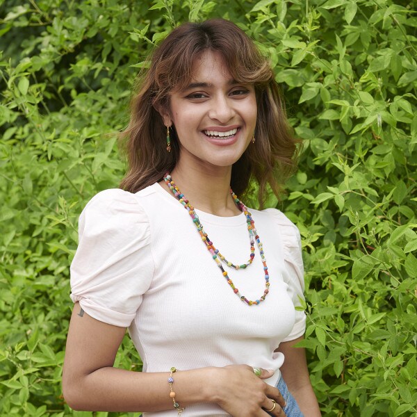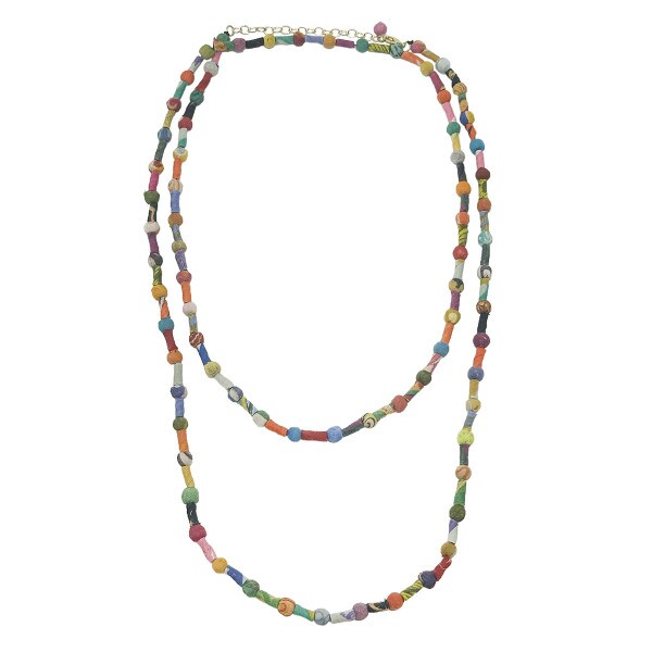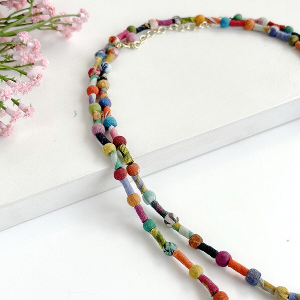 Cylindrical scrolled Kantha beads alternate with classic round beads for an interesting mix of shapes, colors, and textures. It’s delicate and lightweight, yet statement-making. Crafted from repurposed Sari and Kantha fabric, the colorful beads are all one-of-a-kind.